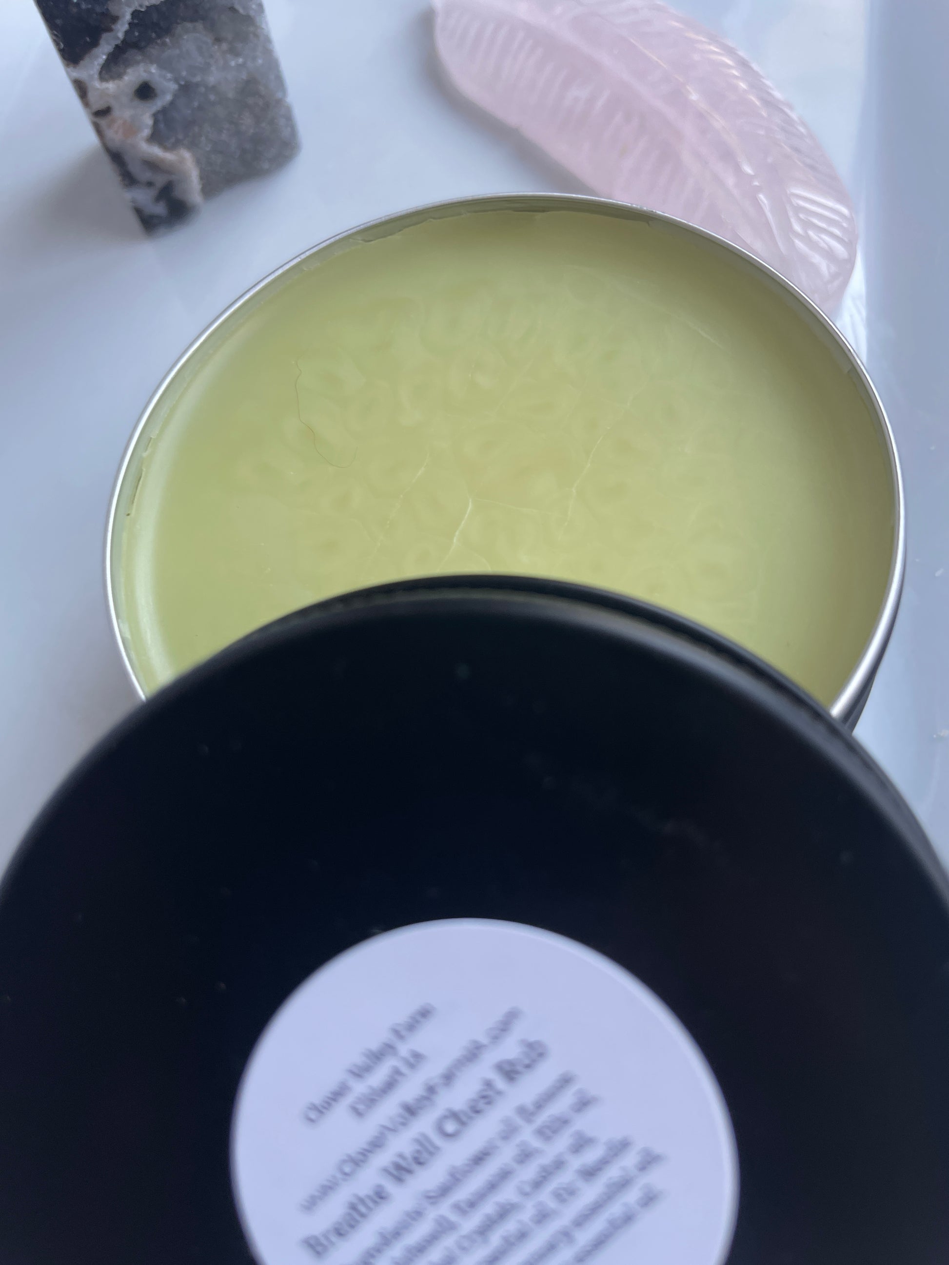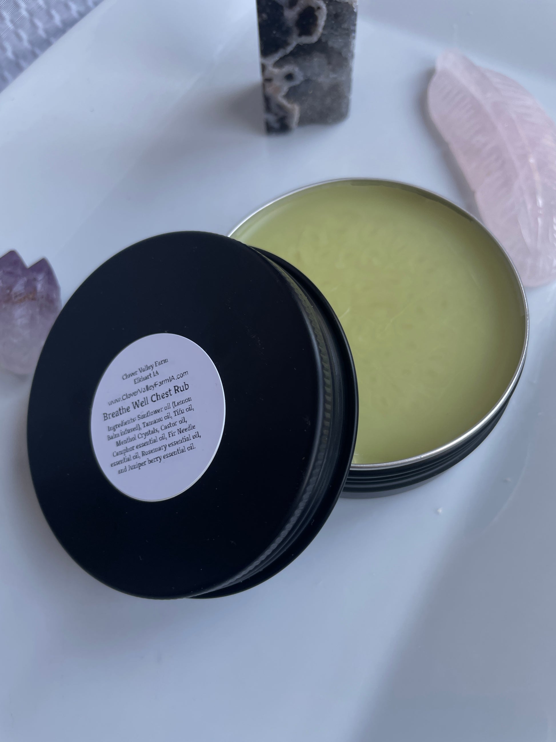 Improve your breathing and find natural relief from congestion and coughs with our Breathe Well Chest Rub. This healing salve is made with a blend of powerful ingredients, including Lemon balm infused Sunflower oil, Tamanu oil, Castor oil, Menthol crystals, Tifu oil (a Chinese medicinal ingredient), Peppermint, Wintergreen, and Spearmint extracts, as well as Fir Needle, Rosemary, and Juniper Berry essential oils.\n\nWe've carefully chosen each ingredient for their anti-inflammatory properties and their ability to open up your breathing passageways. The addition of beeswax helps thicken the rub for easy application. Our chest rub comes in a convenient 2.7 oz size and can be used as needed. For even better results, apply to your feet at night and cover with socks to help with middle-of-the-night coughing.\n\nPlease note, this chest rub may be too strong for children under 6 years old. If you intend to use it for younger children or babies, please let us know and we can make a less potent version that is safe for them. We take great care in creating our products and always prioritize the safety of our customers. Order now to experience the natural relief of our Breathe Well Chest Rub.