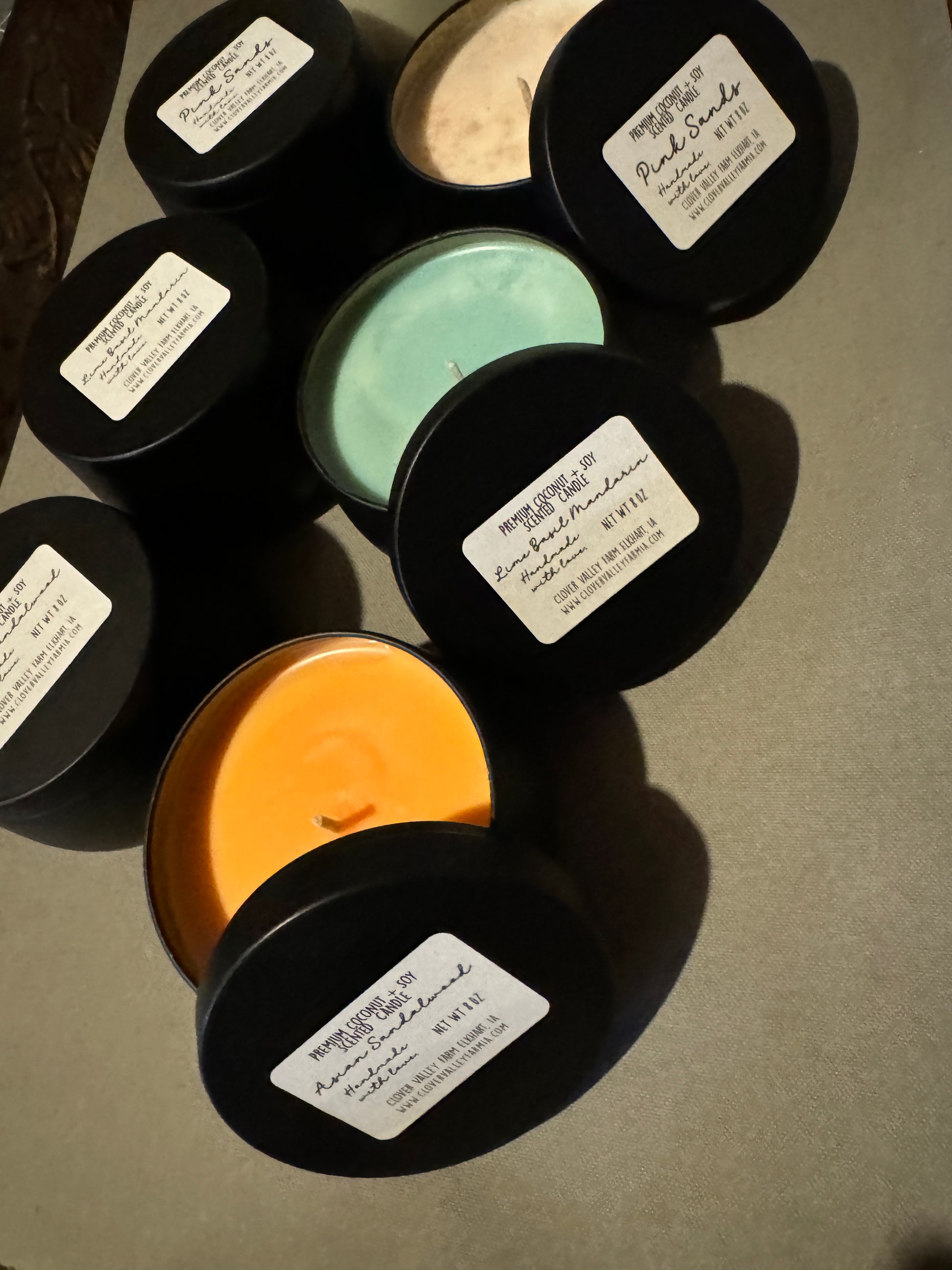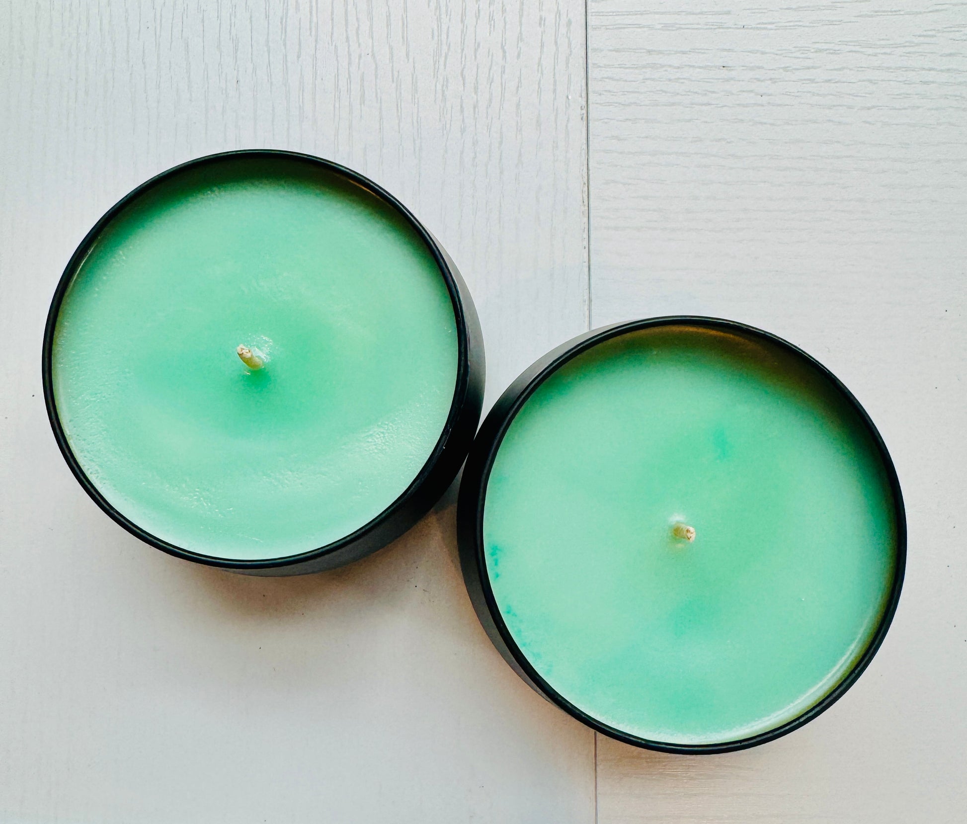 8 oz Candle, Black metal tin and 40+ Hours burn time.
