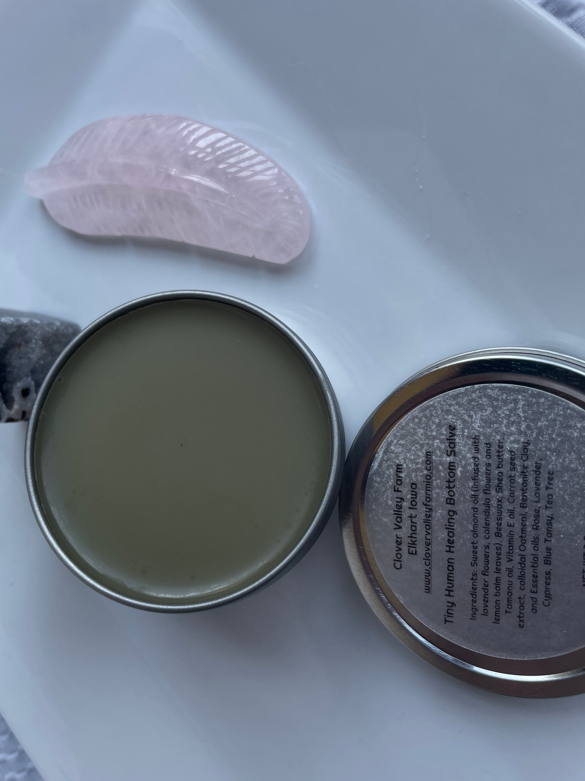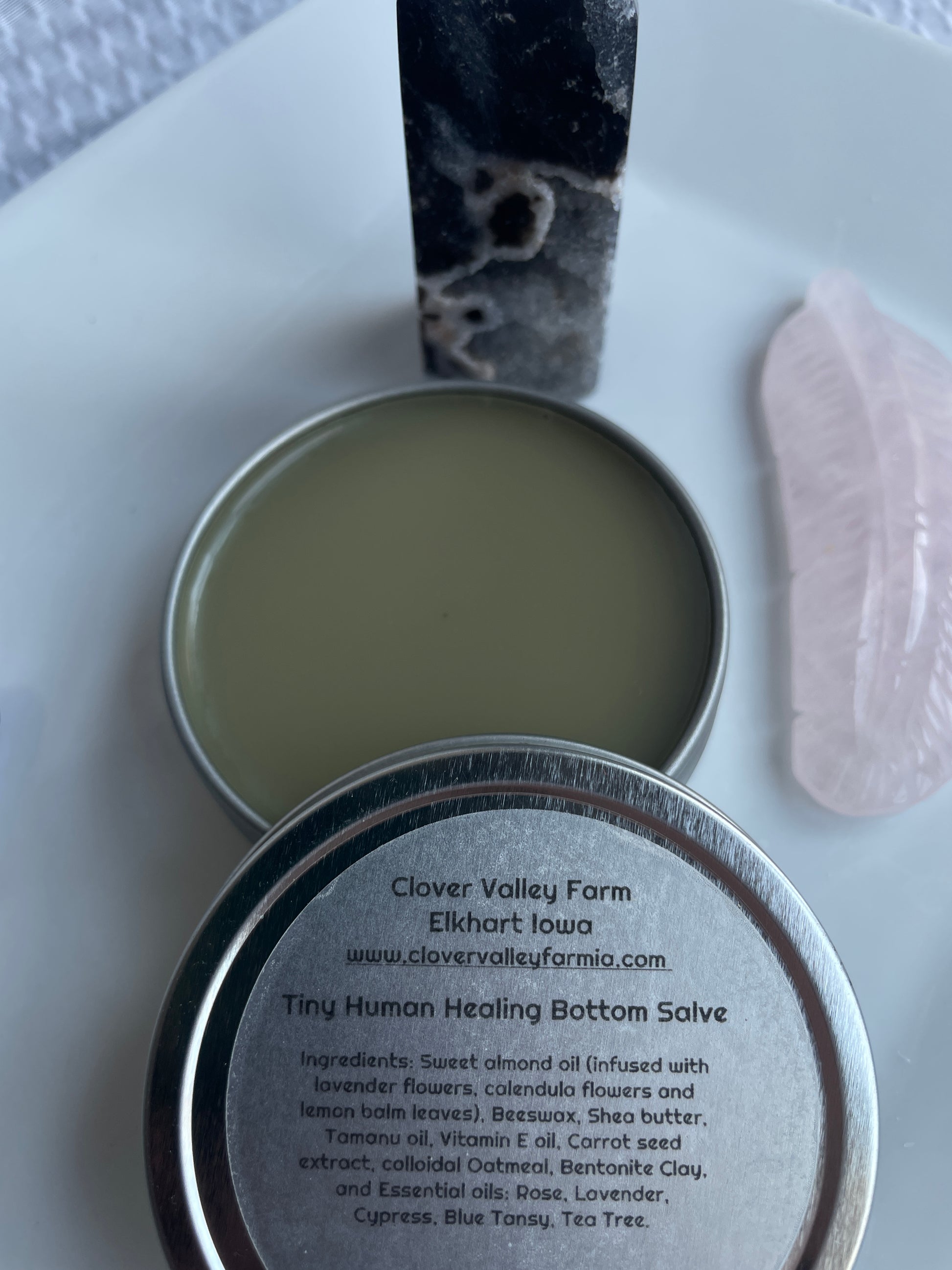This Clover Valley Farm Organic Baby Butt Salve is a natural and effective solution for diaper rash relief. After struggling to find a product that worked for my five children, including two with sensitive skin and severe diaper rash, I decided to create my own formula.\n\nMade with gentle yet powerful ingredients, this healing salve includes Lavender, Lemon Balm, and Calendula infused Sweet Almond oil, Tamanu Oil, Shea Butter, Vitamin E, Colloidal Oatmeal, Bentonite Clay, Carrot seed Extract, and Beeswax. These ingredients provide anti-microbial, anti-fungal, and detoxifying benefits for your baby's delicate skin.\n\nBentonite clay is known for its amazing healing and detoxifying properties. It absorbs moisture, removes toxins and impurities, and fights bacteria. This is important for maintaining a healthy balance of bacteria on your baby's skin, as too much can lead to inflammation and soreness.\n\nThe combination of Calendula, Lavender, and Lemon Balm not only provide anti-viral and anti-inflammatory properties, but also soothe and calm irritated skin. These essential oils, including Rose, Cypress, Blue Tansy, and Tea Tree, create a beautiful and calming scent.\n\nThis salve is a must-have for any parent looking for a natural and gentle solution for diaper rash. It is intelligently crafted to work with your baby's skin microbiome and provide the best possible relief. Say goodbye to stubborn and irritated skin with Clover Valley Farm Organic Baby Butt Salve.