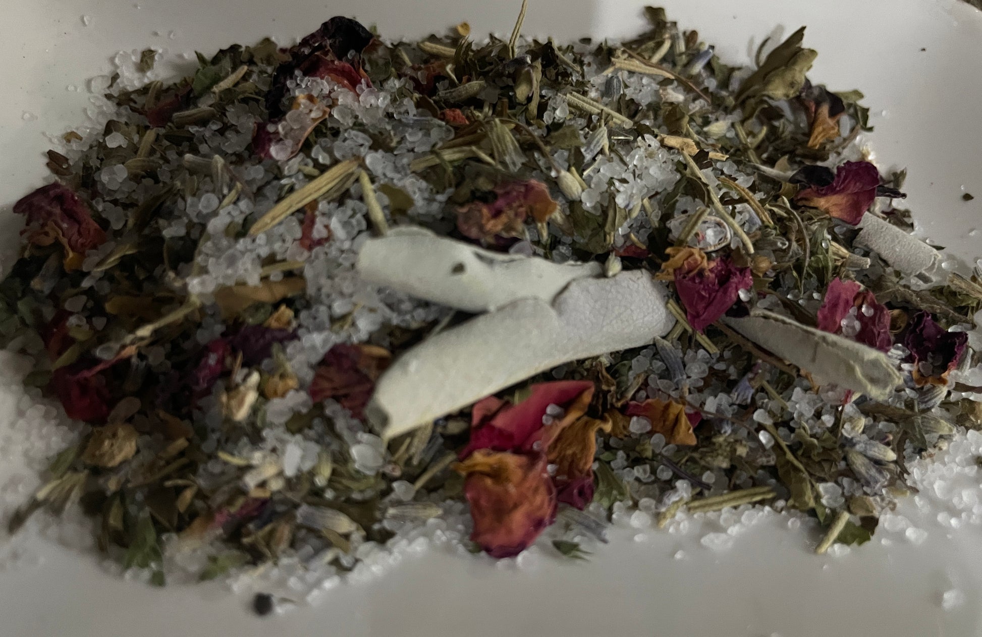 Dead Sea Salt, Epsom Salt, Baking Soda, Rosemary, Sage leaf, Lemon Peel, Activated Charcoal, Bay Leaves, Holy Basil, Mugwort, Rose Petals and Thyme Leaves.