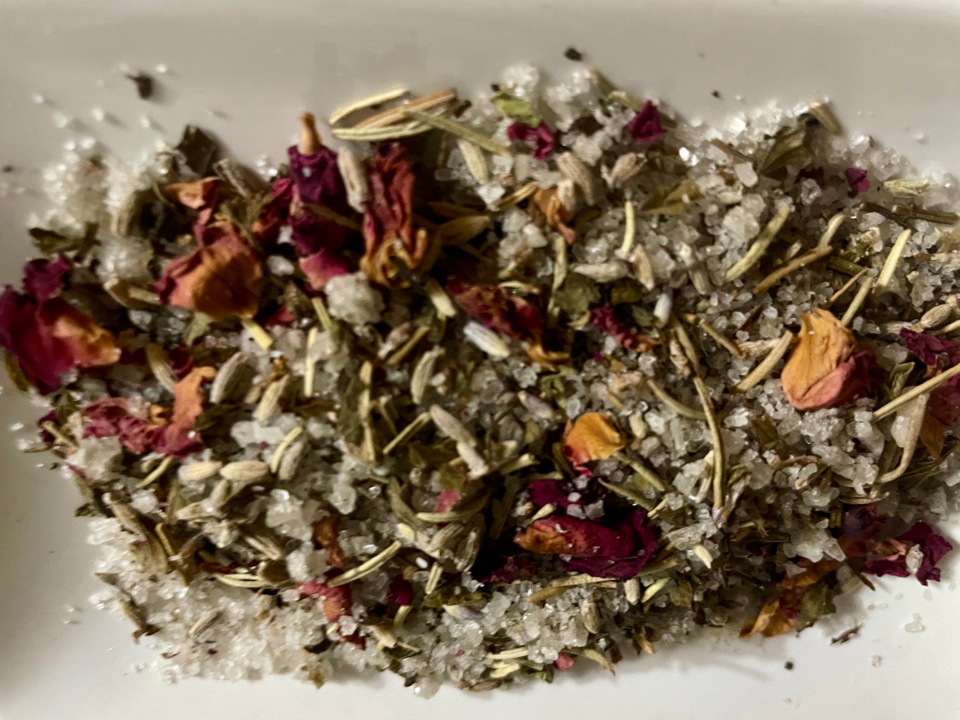 Sea Salt, Epsom Salt, Lavender flowers, Rose Petals, Peppermint, Lemon balm, Mullein, Marshmallow root, Spearmint, Rosemary.
